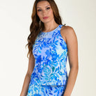This Hight Neck Tankini Top from the Las Palmas collection features a fitted silhouette that offers both coverage and a sleek, sporty look. The racerback design adds a modern touch.