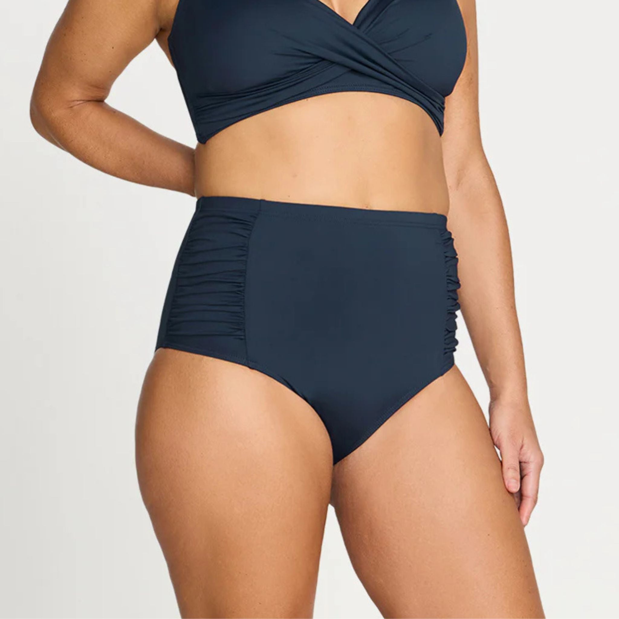 Artesands Fits Your Curves. Artesands navy high waist swim pants perfectly fit your curves. This curve fit and plus size swim pant has 360 degree powermesh lining and ruching in the side panels with good moderate bottom coverage.