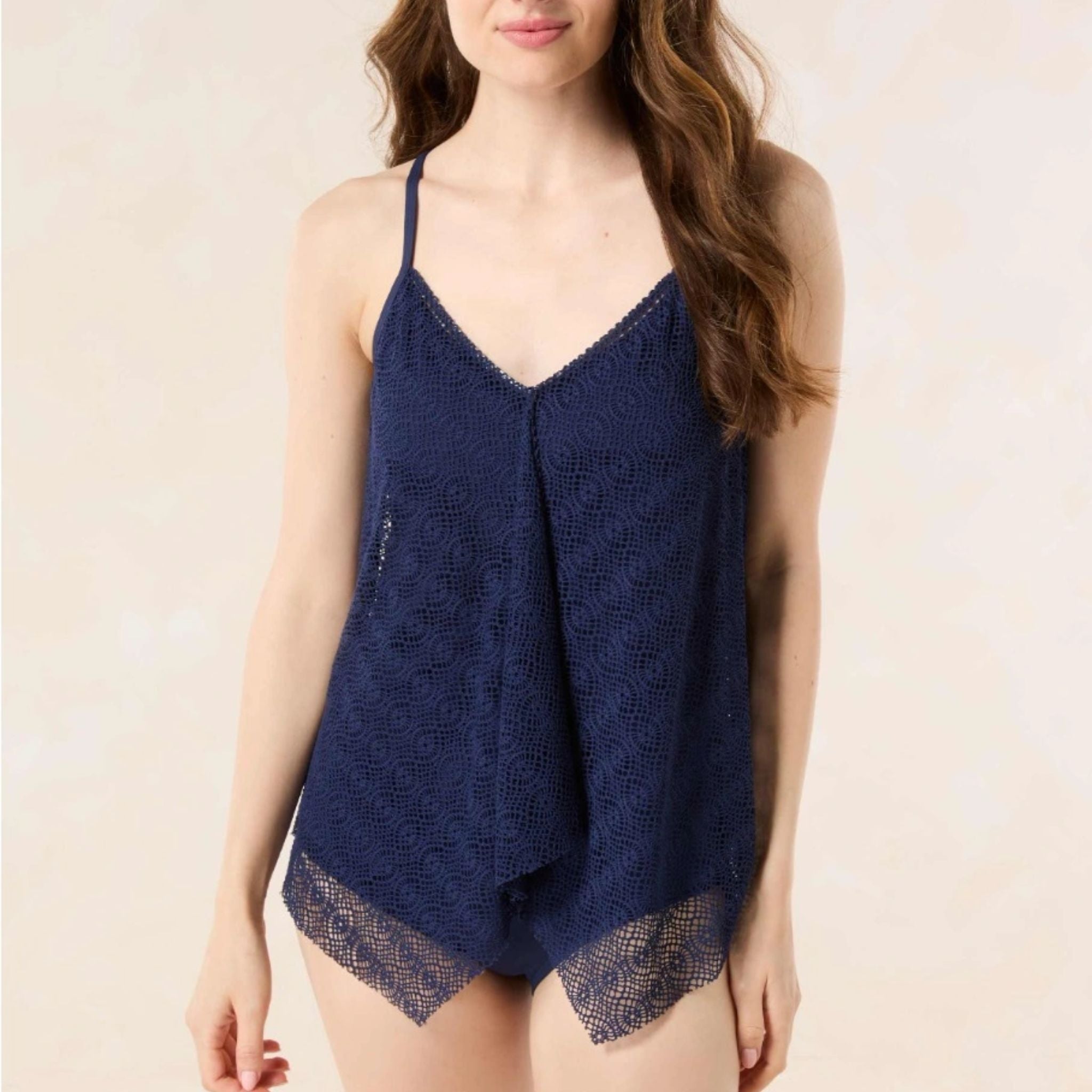 Feel the fresh air in a crochet tankini top with asymmetrical sharkbite hem. Designed with soft, sunburst inspired crochet fabric that can be worn in and out of the water.