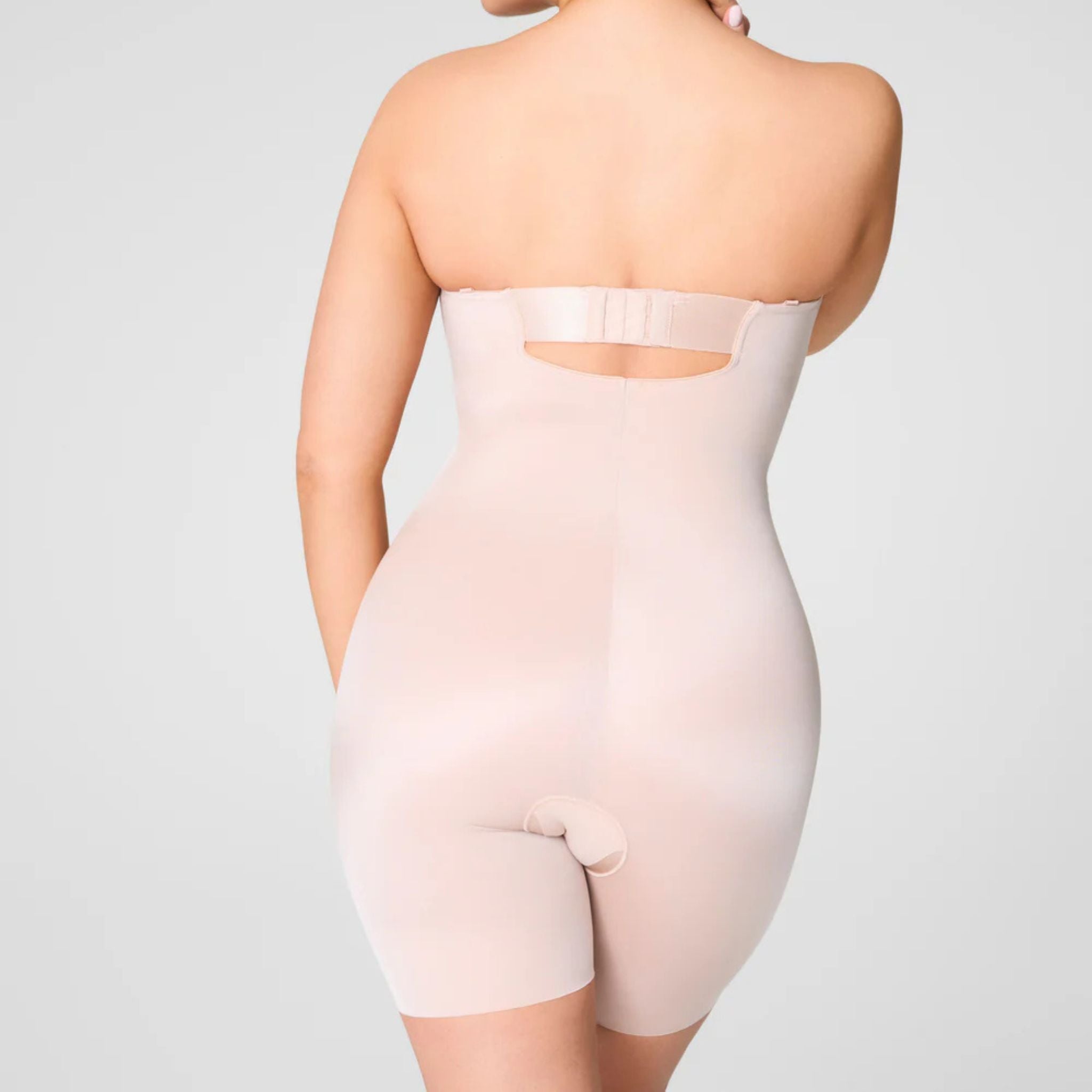 The strapless mid-thigh bodysuit provides all-over compression to shape and support your figure. With fit-flexible and lightly padded cups that serve as your bra, removeable and 5-way convertible straps that eliminate rolling and folding, and free-cut hems that don't squeeze or dig, this will be your go-to, versatile bodysuit for those very specific silhouettes that require very specific shapewear. Crafted from lightweight and cling-free fabric that prevents thigh chafing, it's perfect for all-night wear.