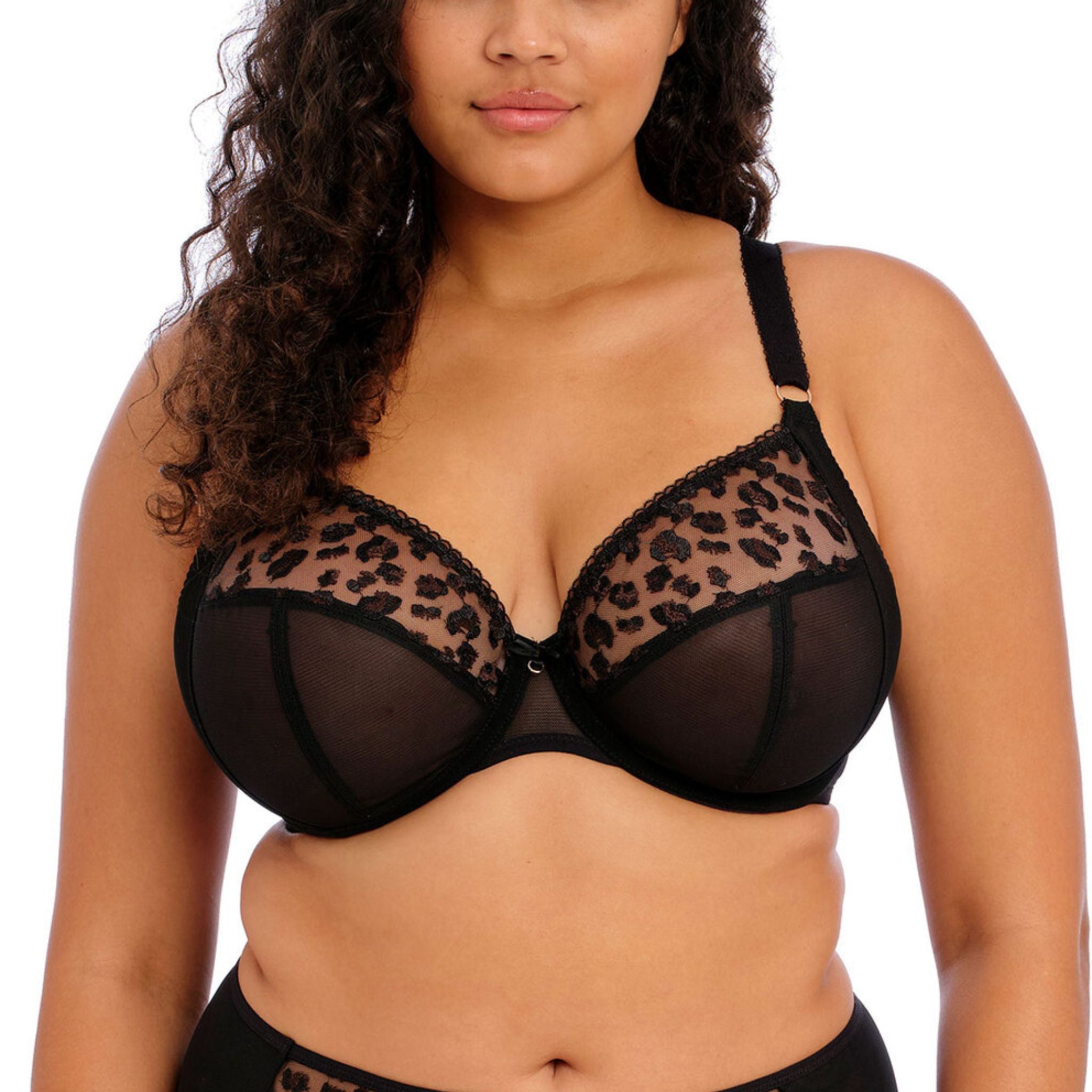 Uncover Elomi's Namrah Bandless Plunge Bra in Black! Based on the beloved Matilda Plunge Bra frame, but with the front cradle removed from under the cups, for a contemporary twist and a lighter look and feel. The dual-toned animal-print embroidery, paired with the mesh panelling along the top cups, also creates a beautiful shimmering design.