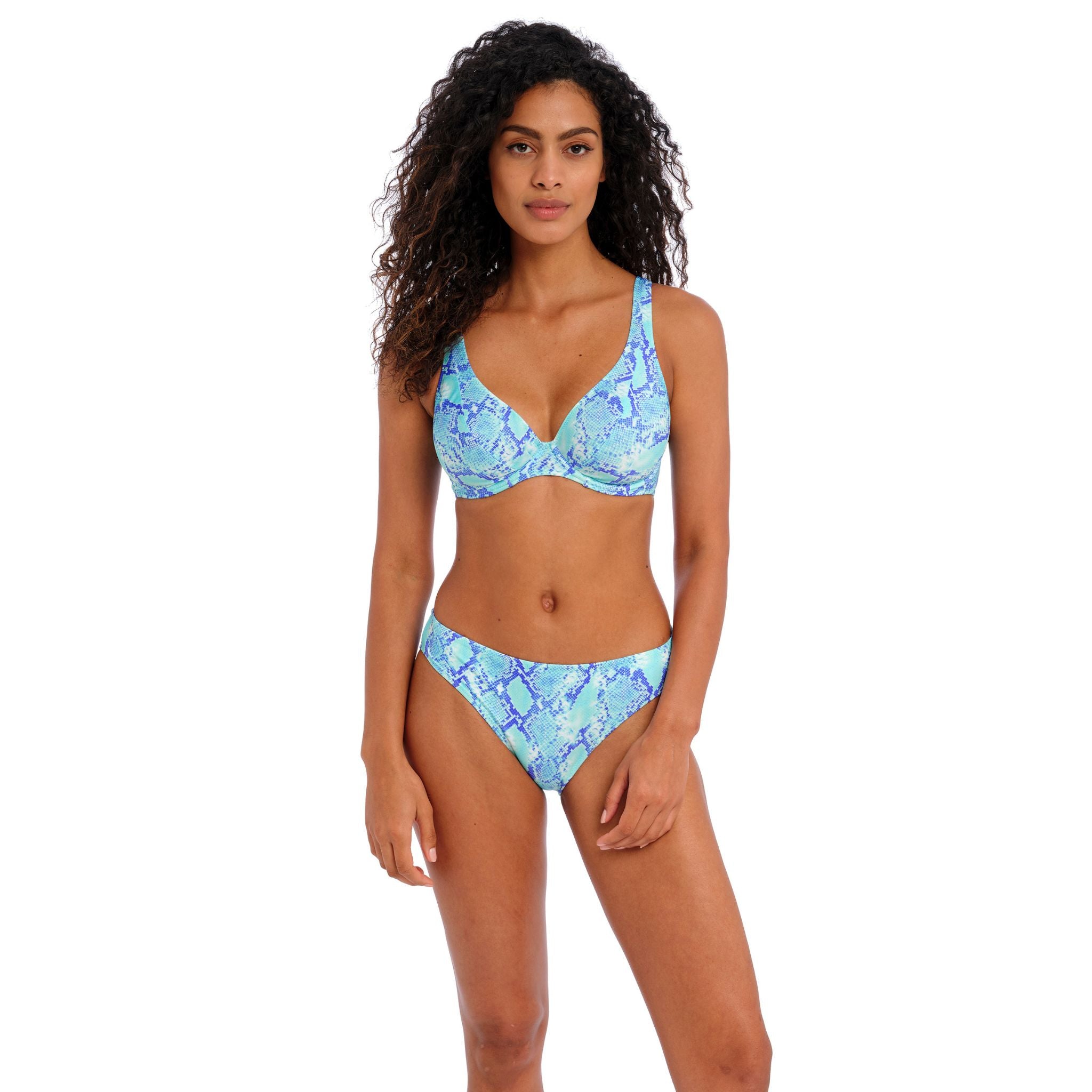 Planning on jetting off to sunnier shores this Summer? Then uncover Freya's Komodo Bay High Apex Bikini Top in Aqua. The cobalt and aqua blue snake print design will add a touch of style to your vacation, whilst the low plunging neckline, elongated apex and powernet lined cups takes care of shaping and our signature Freya support.