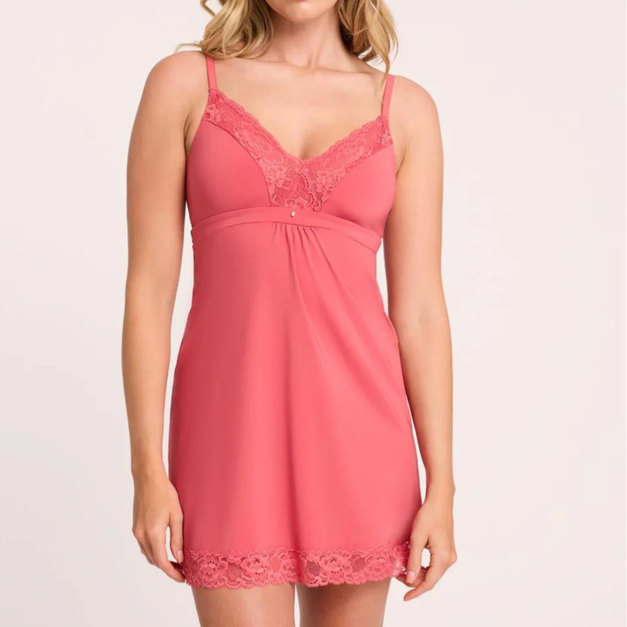 Nighty-night! This flattering A-line chemise in ultra-soft fabric has a secret - it is as strong as it is beautiful. The smooth stretch floral lace along the neckline is lined with mesh for support and the microfiber bust is double lined to enhance your natural shape.