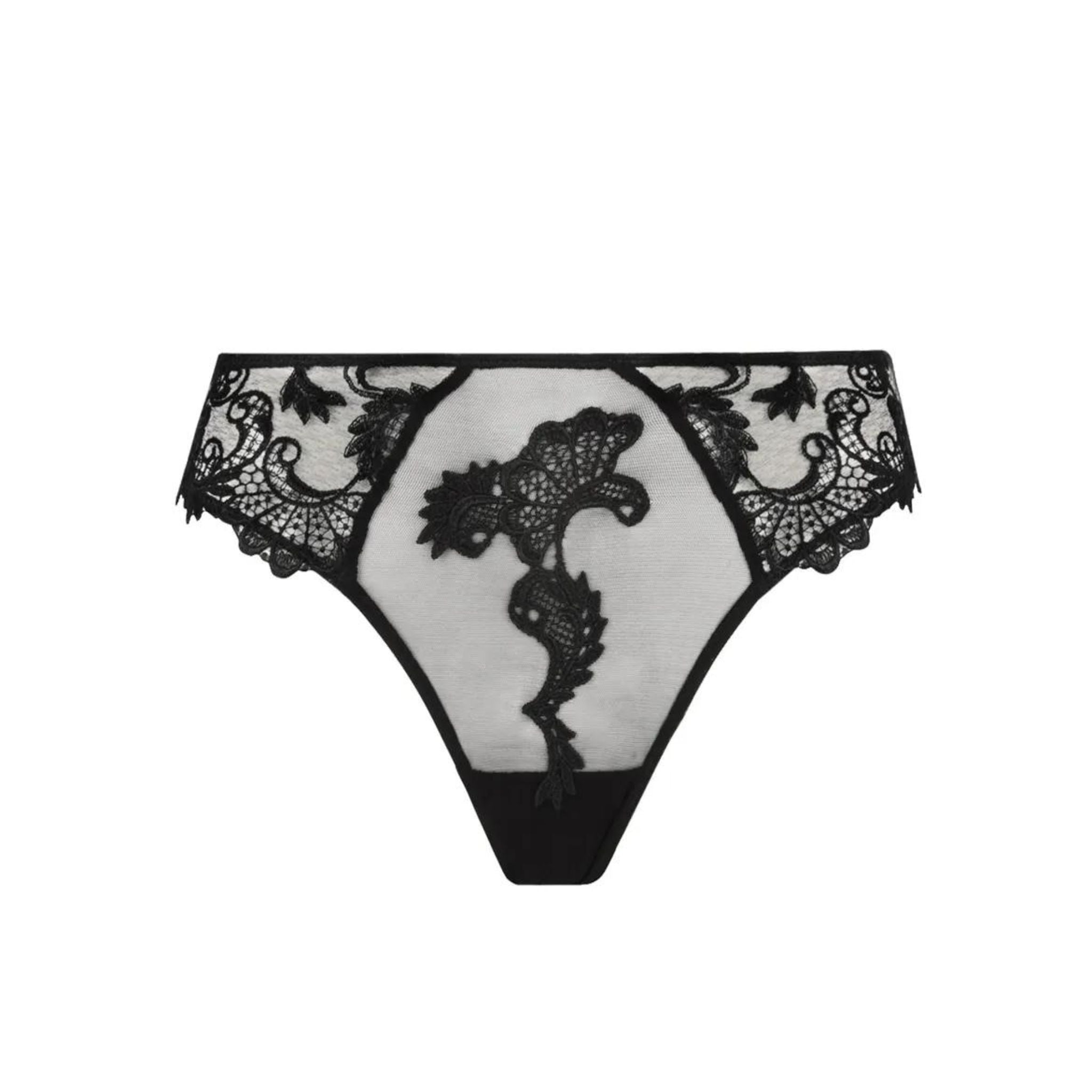 Seduction brief in tulle quite low rise to the front. This brief subtly reveals the wearers backside with sensuality. Guipure details create a tatoo effect. Delicate organza bow to the back.