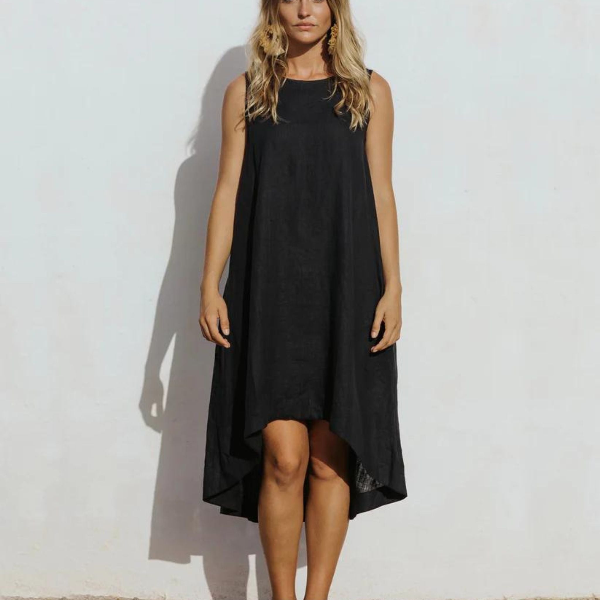 This dress is designed to have a relaxed, loose fit and features an asymmetrical high-low hem, two side pockets, and a coconut button closure on the back. Breathable, lightweight, and effortlessly stylish, it’s destined to become your wardrobe staple.