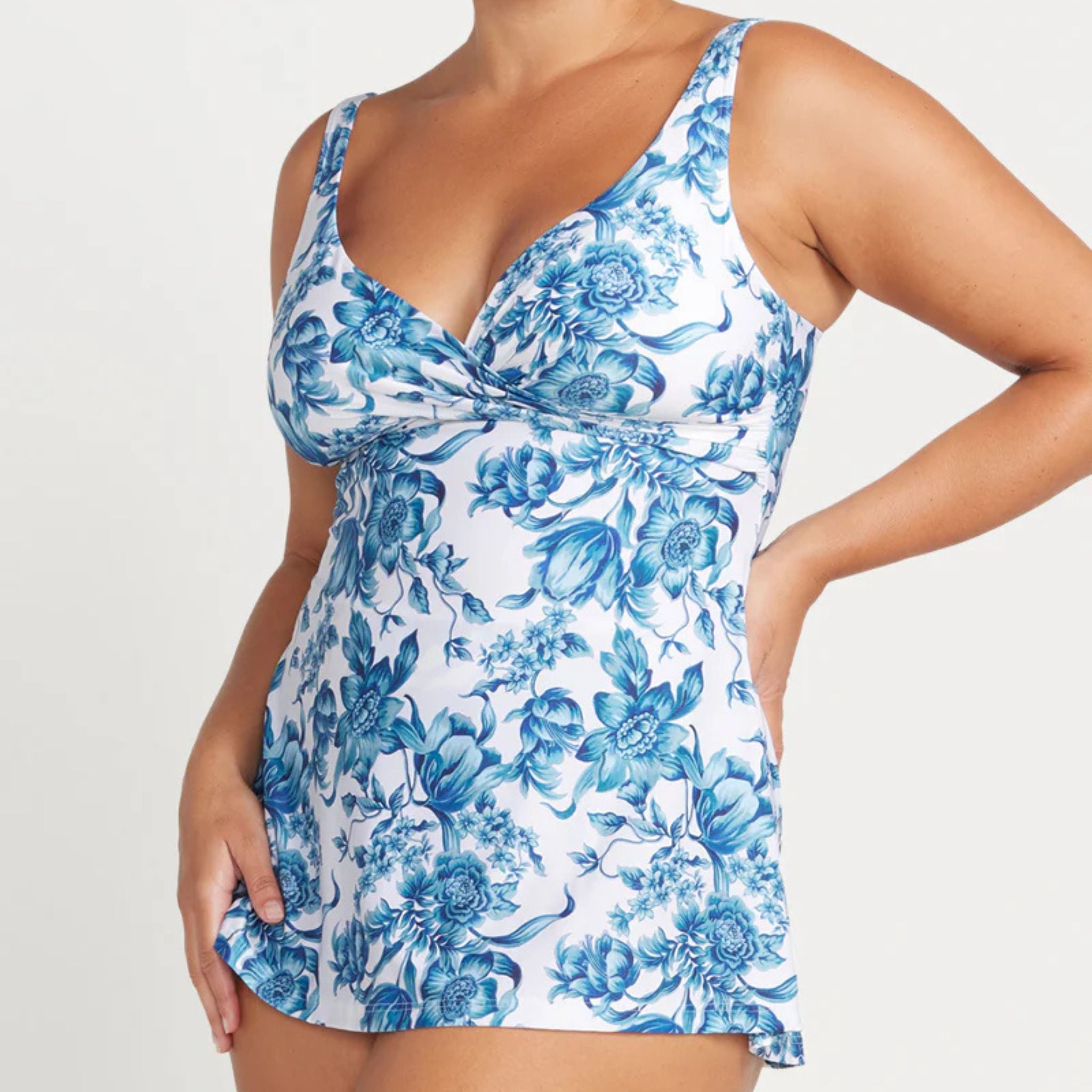 Artesands Fits Your Curves. Artesands Delacroix one piece swimdress shape is their wire free comfort and support swimdress style. Every woman needs a swimsuit that makes you feel good when you put it on and this is Artesands curve fit and plus size shape Delacroix. This style has a cross front design with multifit cup support that fits a D cup , DD cup, E cup, F cup and a G cup. The Delacroix one piece swimdress silhouette is a waist defining A-line design that will not cling to your body. Delacroix has internal full body 360 degree powermesh for body sculpting confidence.
