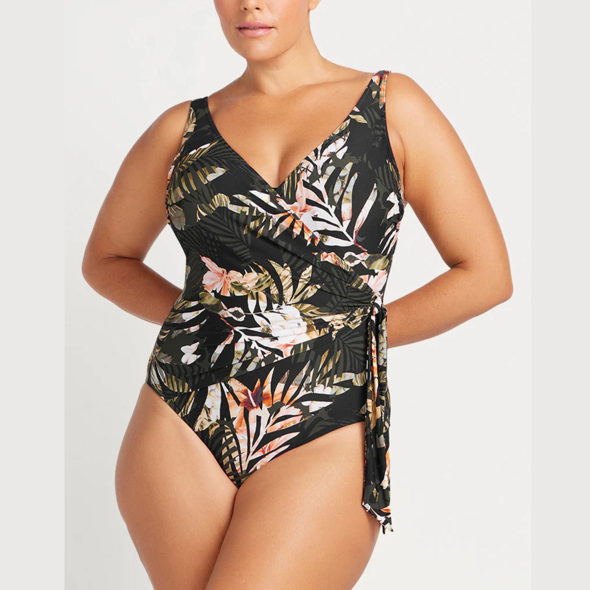 Cross over detail - The Hayes one piece swimsuit has a secured cross front design with a side tie that can be left as a knot or tied in a bow.