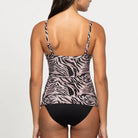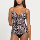 Looped front this tankini top has fabric that loops around at the centre of the bust line. This creates a soft and flattering neckline while giving extra support under the bust, is a multifit design and offers body sculpting attributes of internal powermesh and front panel ruching.