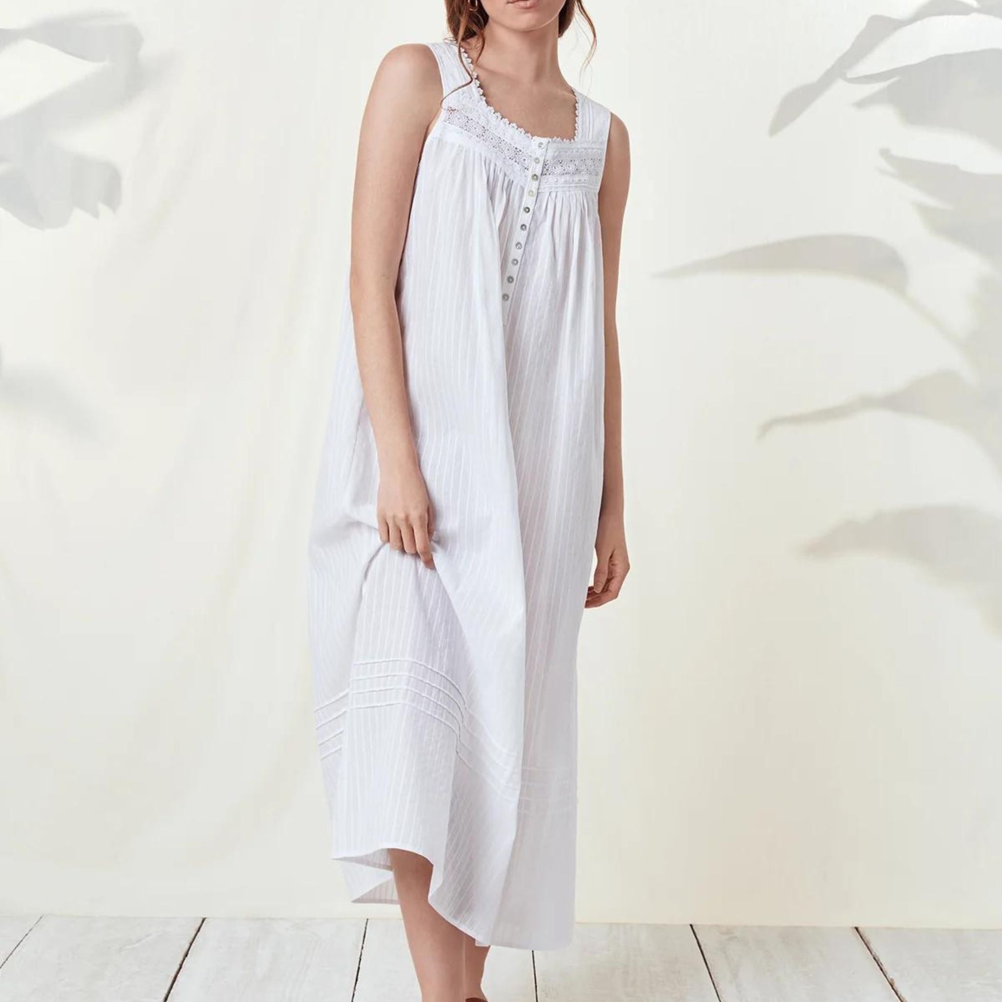 A clean and classic look, this 100% cotton nightgown is designed with a delicate dobby stripe, accented by venise lace at the neckline, pintucks at the neckline and skirt, and a placket of akoya shell buttons.