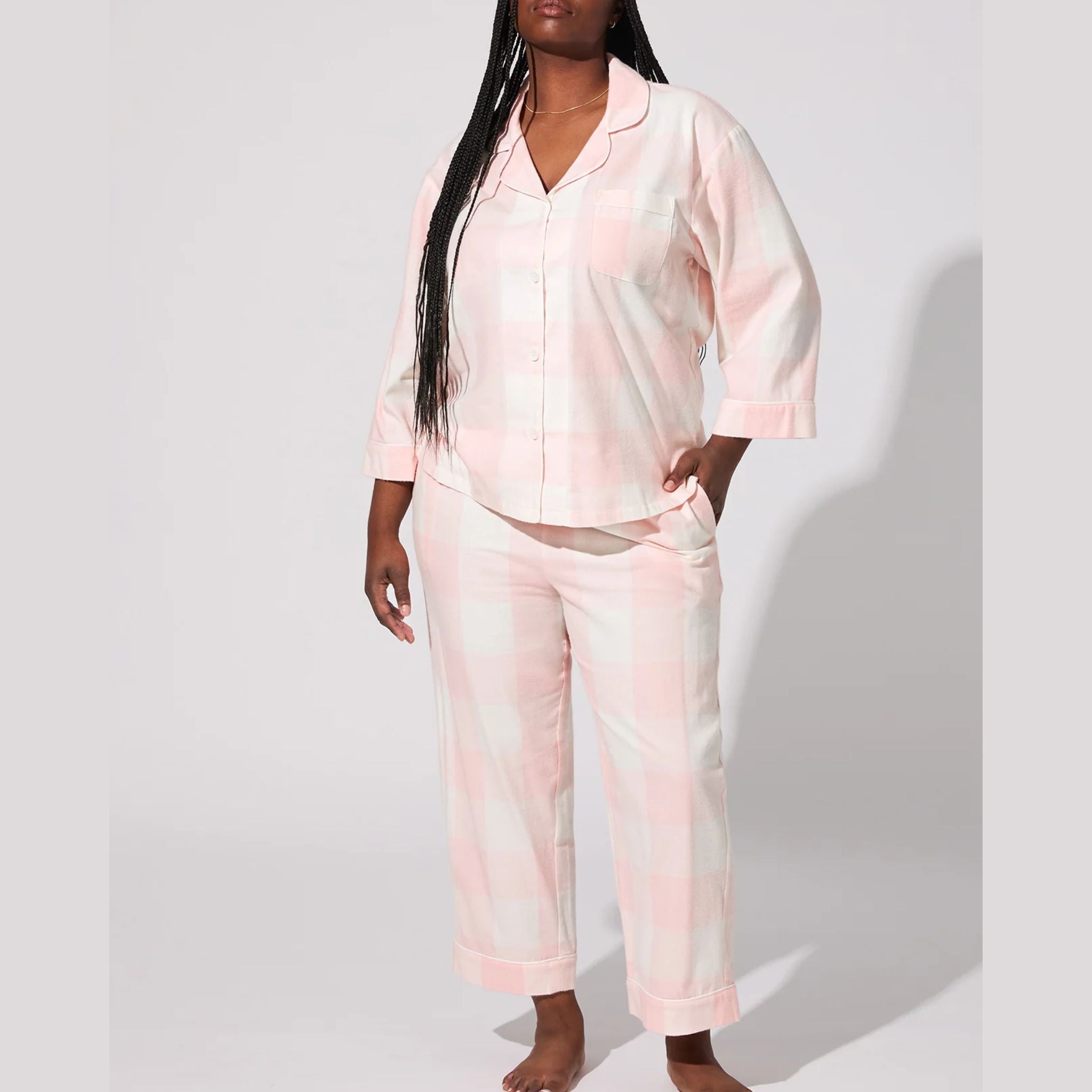 The Opal Pajama Set provides barely-there comfort and a carefree vibe. The babydoll-inspired top swings and sways atop a wide-leg cropped pant with a soft elastic waist. Swing top features a high neckline, cap sleeve, and delicate gathering at the back. 22" inseam.  95% Viscose from USDA Certified Organic Bamboo | 5% Spandex