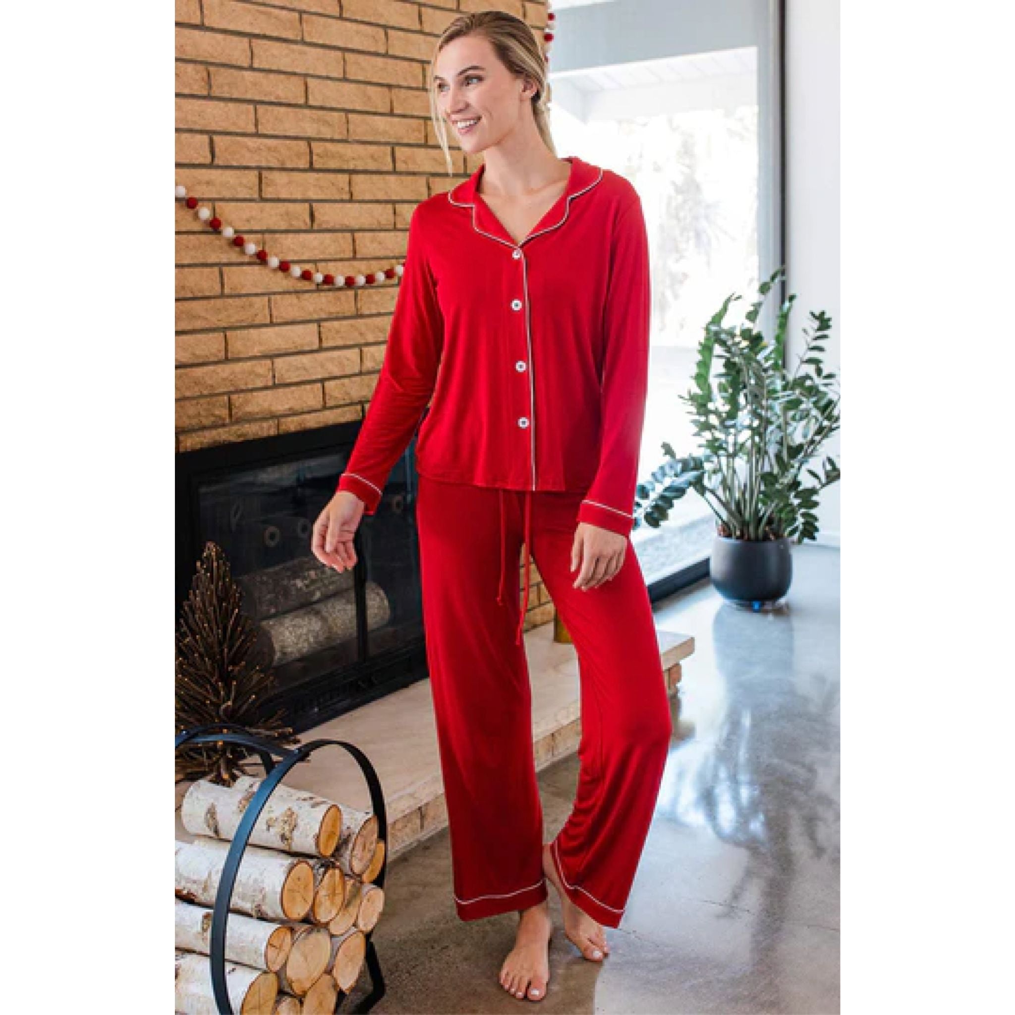 Yala's classic menswear-inspired button-up Amber Pajama Set has been reinvented in our crazy-soft bamboo viscose jersey. The relaxed-fitting silhouette has a pull-on, loose-fitting pant and the top has a notch collar and button front. White contrast piping detail on collar and cuff, long sleeves. Discover your softest sleep. 30" inseam.