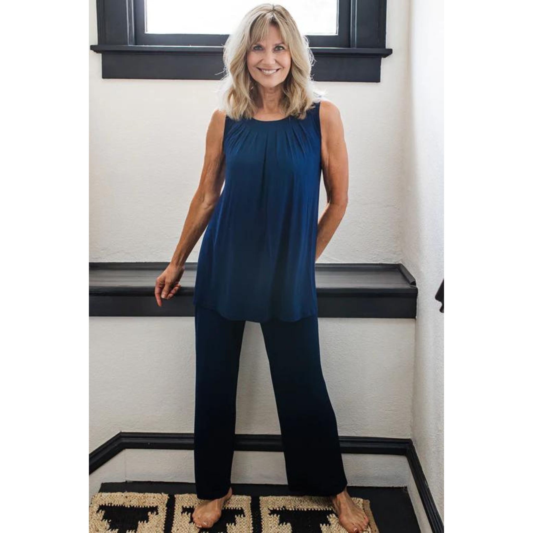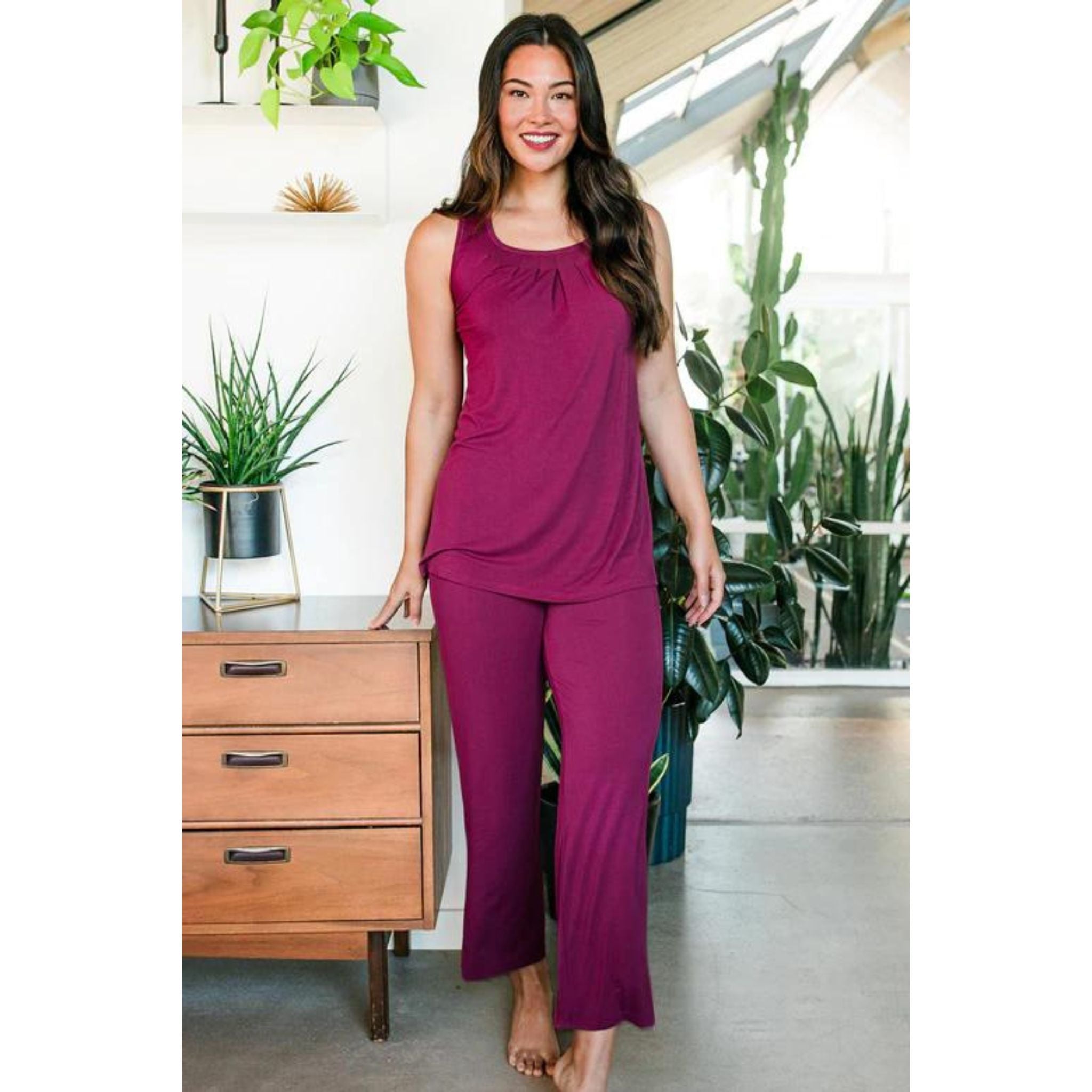 The Delia Pajama Set was designed for slow mornings that turn into afternoons. With just enough thoughtful details, you won't mind answering a surprise knock at the door. This crazy soft bamboo pajama set features pin-tucked detail in front and a keyhole opening in the back. Tank top with a straight, below-hip hemline. Elastic waist, ankle-length pants with a 28" inseam. Roomy fit for your comfort; size down for a snugger pant fit.