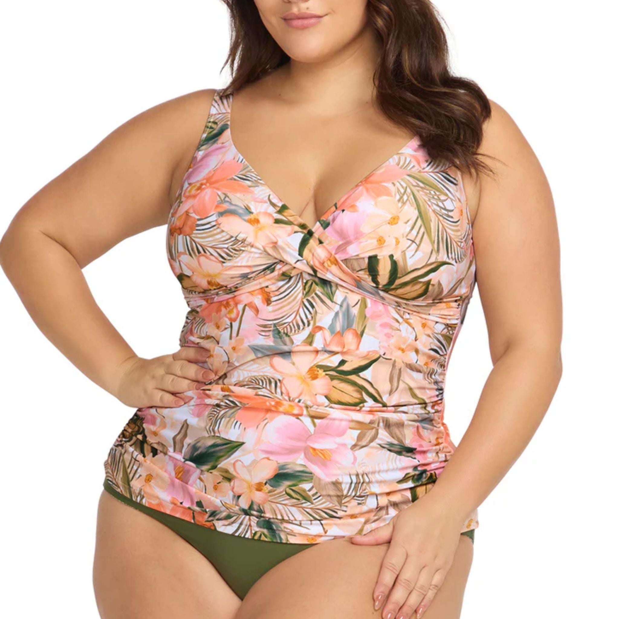 Artesands fits your curves. Make a curve statement in our Artesands Cezanne plus size tankini top, the most flattering swimsuit shape EVER. Artesands Cezanne tankini top shape has a mock knot tie at the front that covers a full internal cup support system. Artesands Cezanne shape is an underwire style with full foam cups that create great bust shape for a D cup to E cup. But it is the peep hole on this style that creates the most amazing figure flattering illusion. The peephole creates a body enhancing hourglass shape and when paired back with Artesands full body 360 degree powermesh and Artesands front panel ruching this style is truly flattering. Artesands curve fit and plus size tankini tops are long line to avoid the fabric riding up when you're in the water.