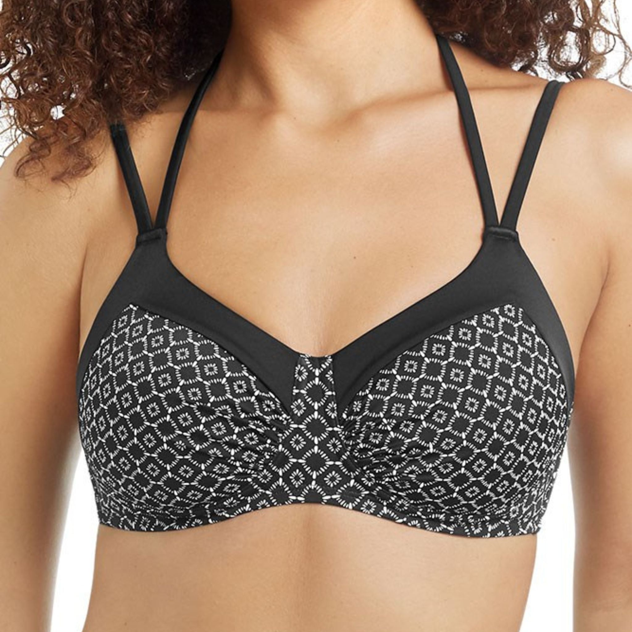 Ayon bikini top is a wire-free soft bra swim top with geometric black and white all over print in front and back