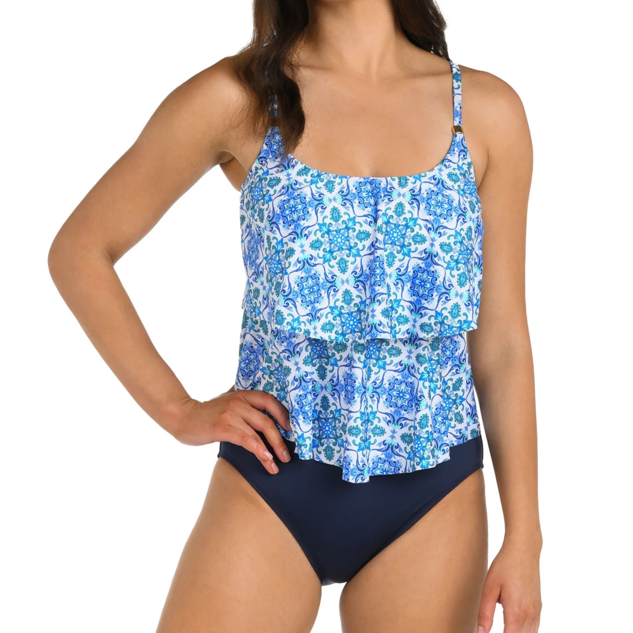 Make a splash with the Beachside Tile Tiered Tankini! This playful swimwear features a unique tiered design that will make you stand out on the beach. With a fun and quirky style, you'll love lounging in the sun and making a statement. Get ready to turn heads and have some fun!