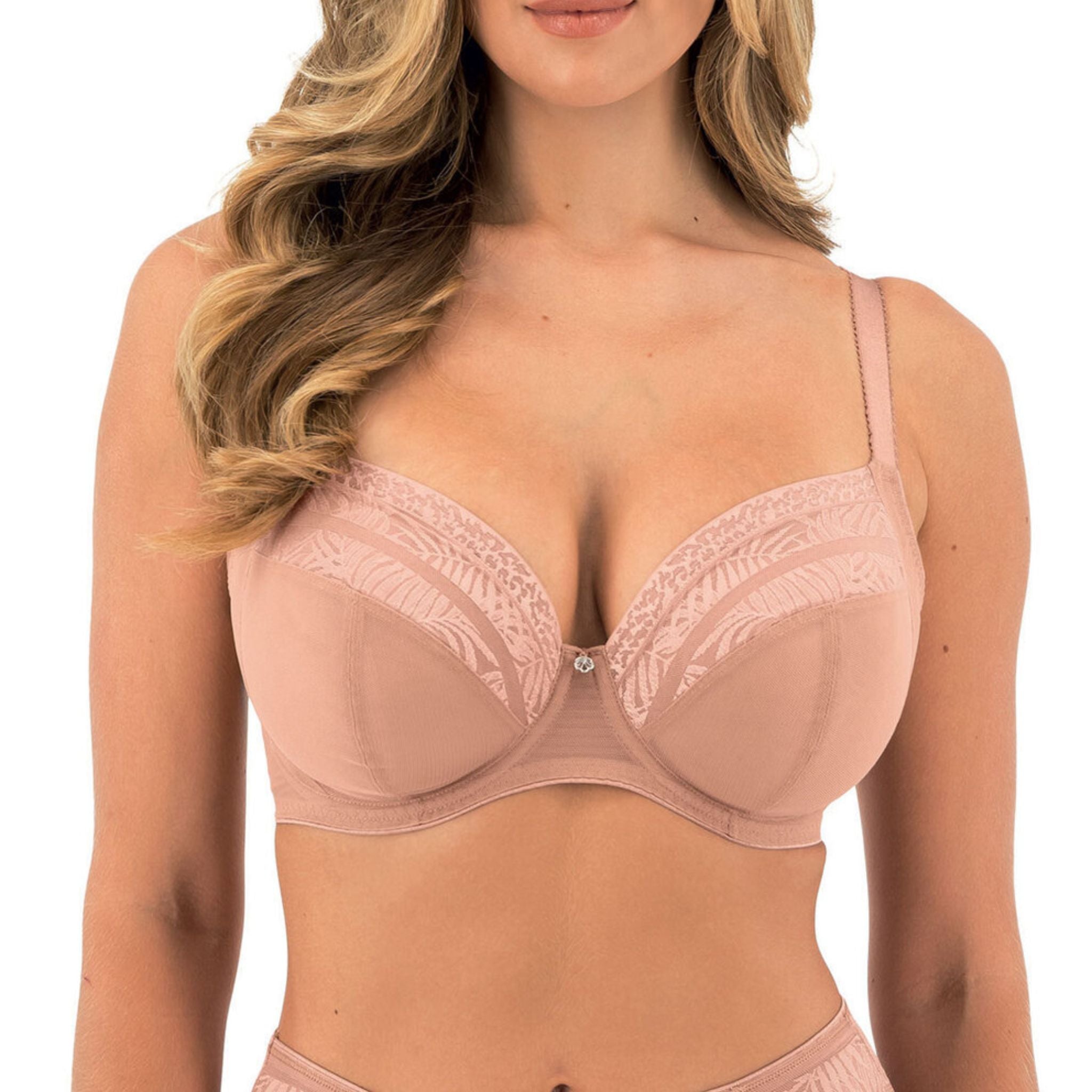 Capture comfort with Fantasie's all-new Devote. Crafted from a semi sheer fabric for a delicate finish, and decorated with a subtle palm leaf design throughout the lace for a contemporary look. Fantasie's Side Support Plunge Bra features a low centre front for a flattering neckline, whilst three piece cups offer great uplift and forward projection.