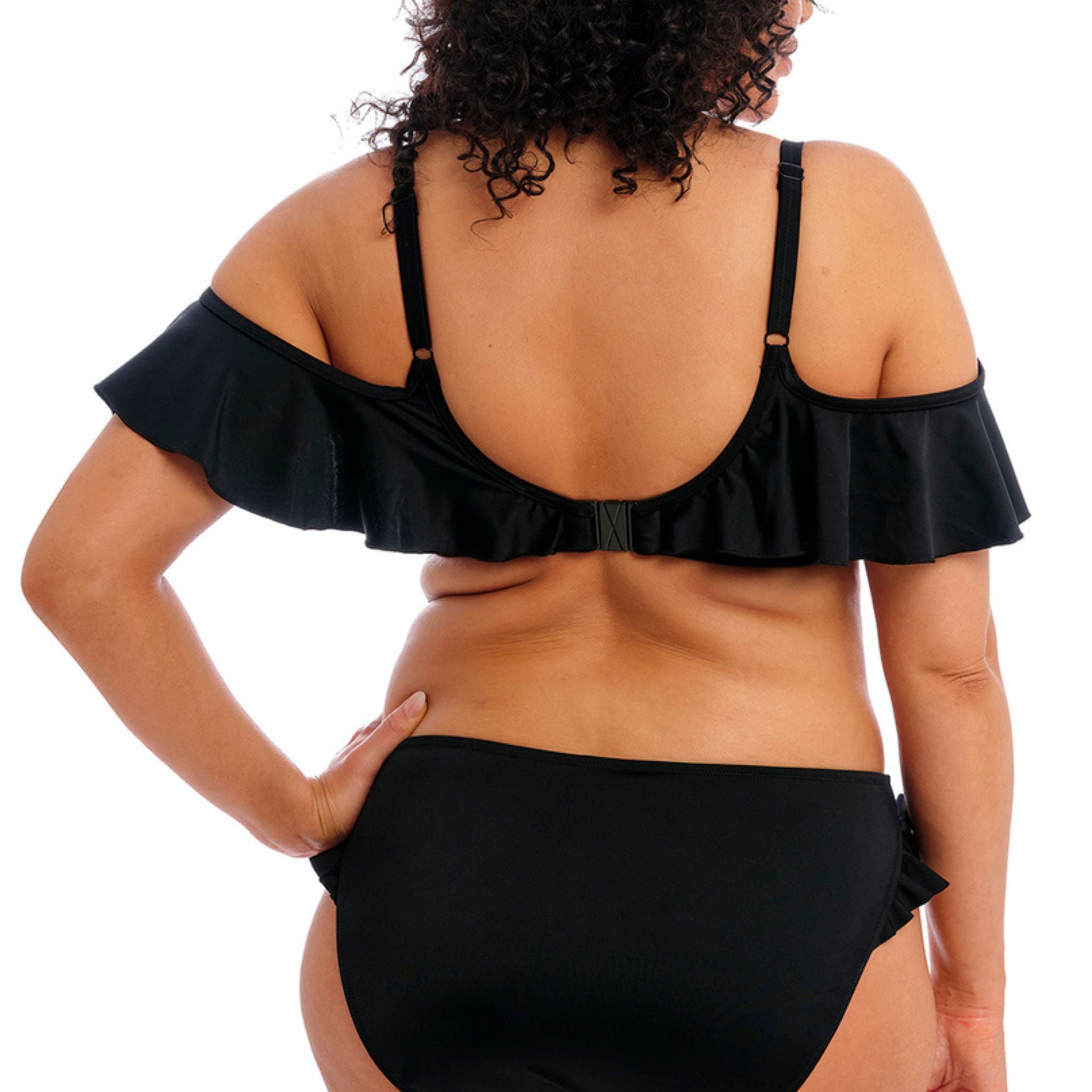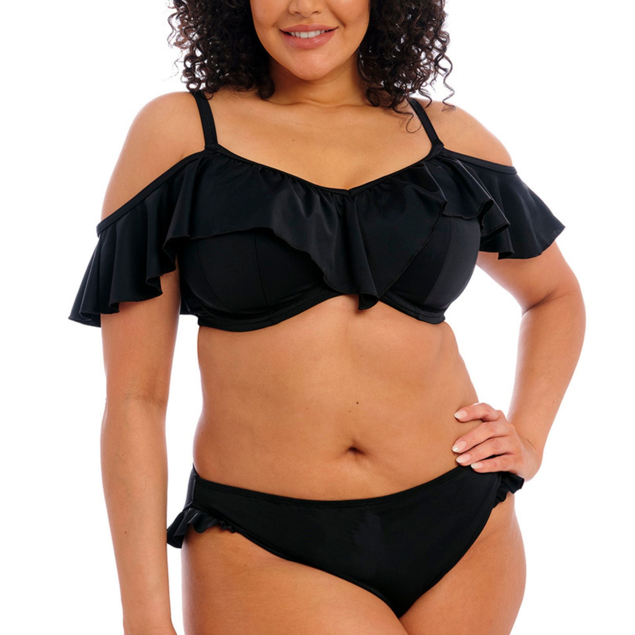 For an oh-so-feminine touch to your swimwear collection, uncover Elomi's Plain Sailing Bardot Bikini Top in the classic Black hue. Showcasing a fully lined, supportive Bikini Top, based on Elomi's bestselling Essentials Plunge Bikini Top. Complete with a playful ruffle that can be worn on or off the shoulders along the top of the cups.